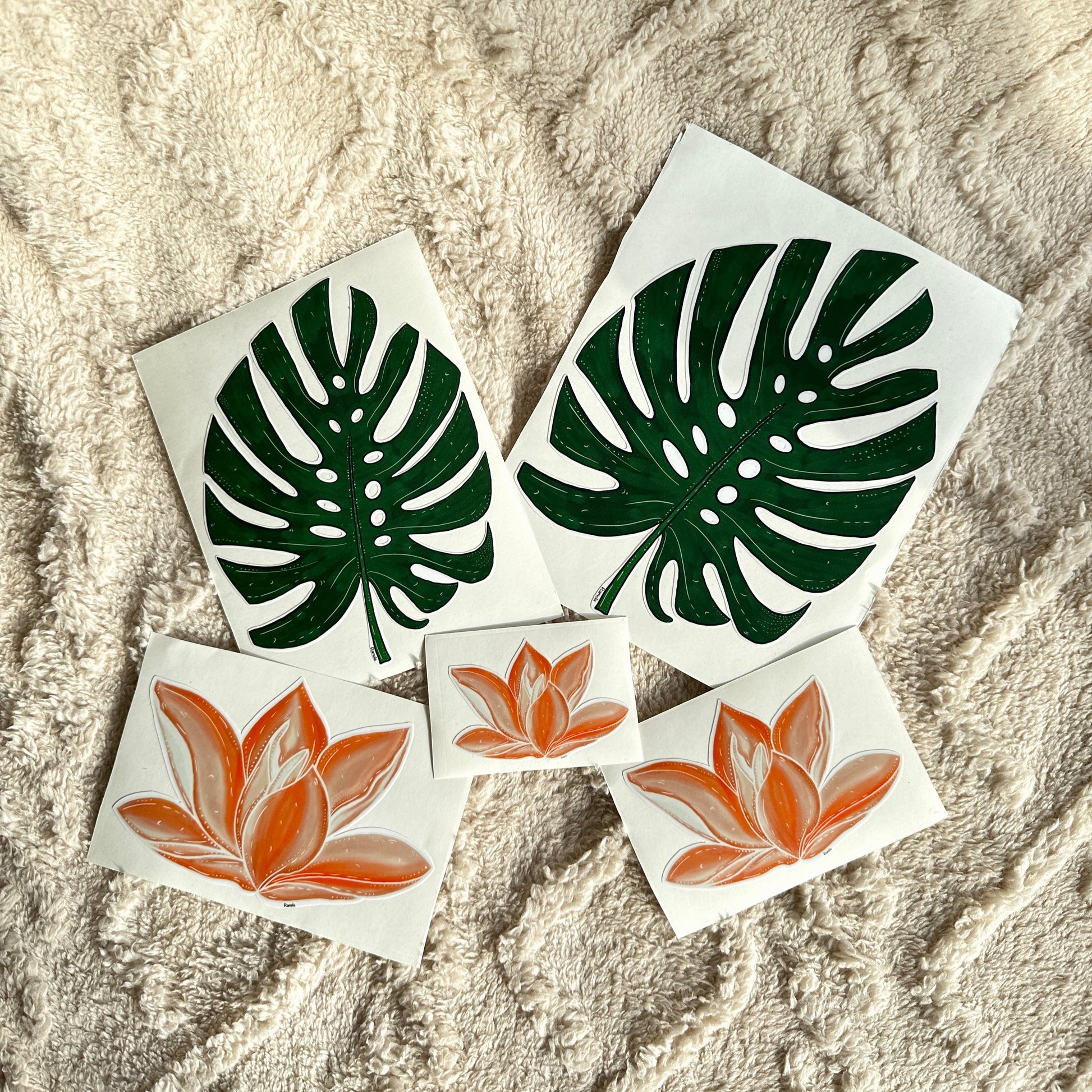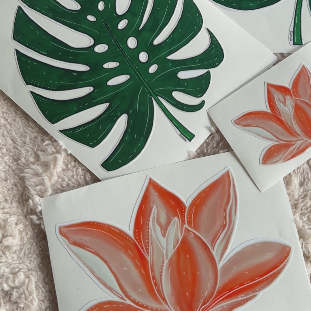 Monstera leaf & Orange flower stickers: Set of 5